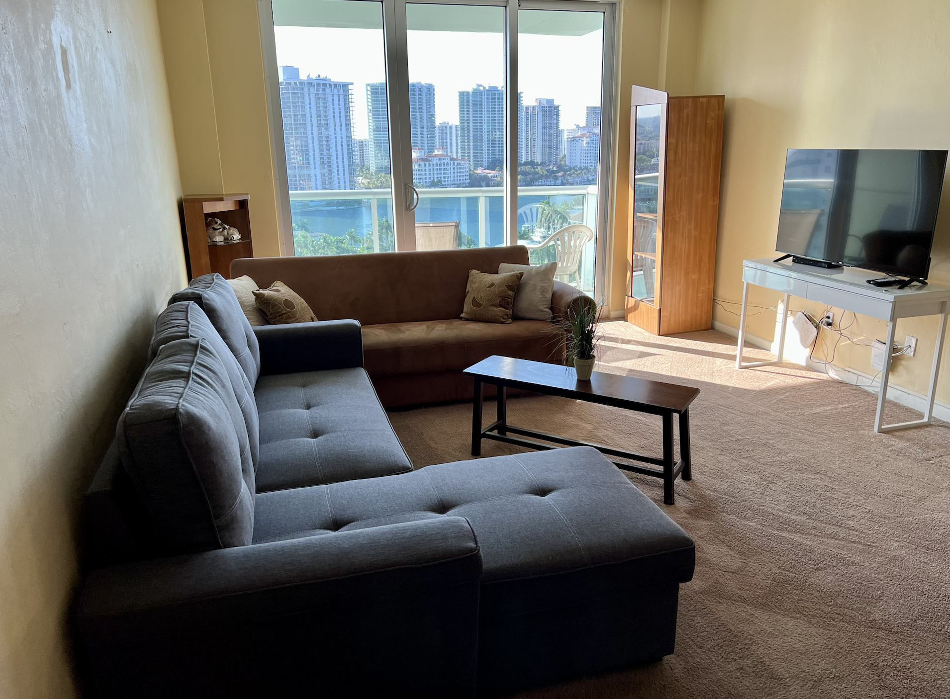 Living Room: Comfortable sofa 50' LED TV with cable and exit to balcony.